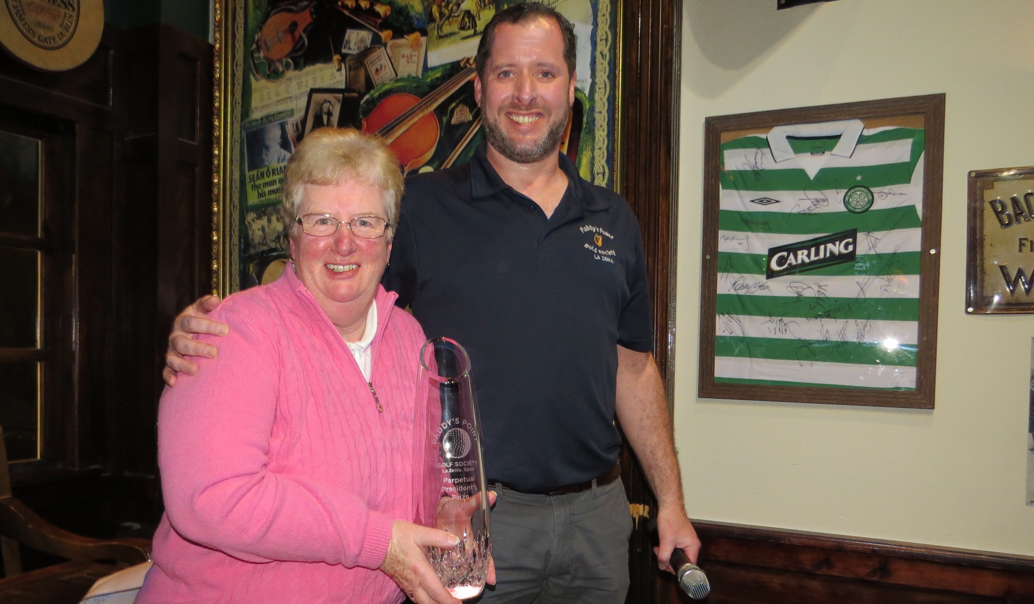 De foto toont onze voorzitter Rory Lee die de trofee uitreikt aan de winnaar, onze aanvoerder, Myra Coull.