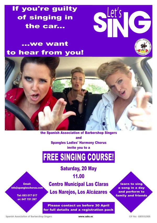 Hulp is nabij! De Spaanse Vereniging van Barbershopzangers (SABS) biedt een gratis Cursus “LEER HARMONIE ZINGEN IN ÉÉN DAG” op zaterdag 20 mei 2017 in LOS ALCÁZARES