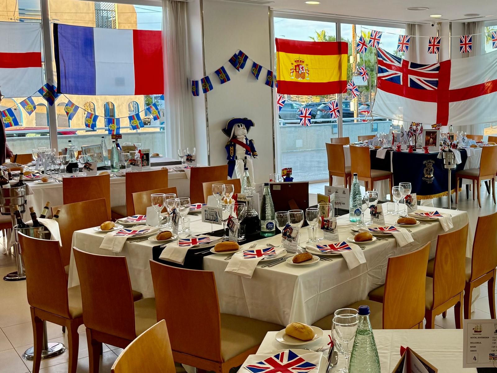 Na het voortreffelijke driegangenmenu en de overvloedige wijnstroom was het traditie om de port door te geven en de glazen te vullen ter voorbereiding op de toost op “Su Majestad Rey (Koning) Felipe VI van Spanje en Koningin Letizia van Spanje” (staand) en “Zijne Majesteit Koning Charles III en Koningin Camilla van het Verenigd Koninkrijk” (zittend, op de traditionele manier van de Royal Navy). Voordat de laatste toost werd uitgebracht op de “Onsterfelijke nagedachtenis van Admiraal Lord Viscount Nelson”, kreeg het publiek een verhelderend en amusant verslag te horen van het leven van Lord Horatio Nelson door Kapitein Antony Crabb RN.